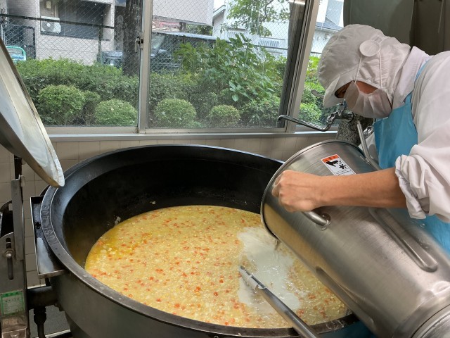 10月22日 給食室のひとコマ 公開日 2025/10/22 更新日 2025/10/22 給食 お米のポタージュを作っている様子です。お米を鶏ガラと野菜でとったスープで煮込み、とろっとしたおかゆを作ります。これをミキサーにかけてなめらかにしたものを、スープに加えてとろみをつけました。お米の優しい甘みを感じるポタージュで、寒い1日にぴったりでした。 いいね(0)