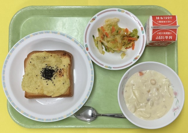 10月24日の給食 公開日 2025/10/24 更新日 2025/10/24 給食 【献立】おいもトースト、ホワイトビーンズシチュー、キャロットソースサラダ、牛乳ホワイトビーンズシチューには、白いんげん豆とひよこ豆が入っています。今日は白いんげん豆は、スープとともにミキサーにかけたため、形はありません。クリーミーなシチューと共に豆のたんぱく質や、食物繊維もとることができます。 いいね(0)