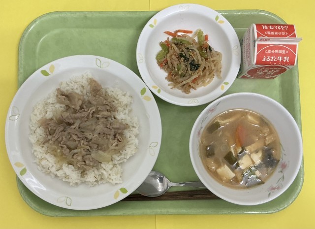 ねぎ塩豚丼、野菜のごま和え、大根とわかめの味噌汁、牛乳