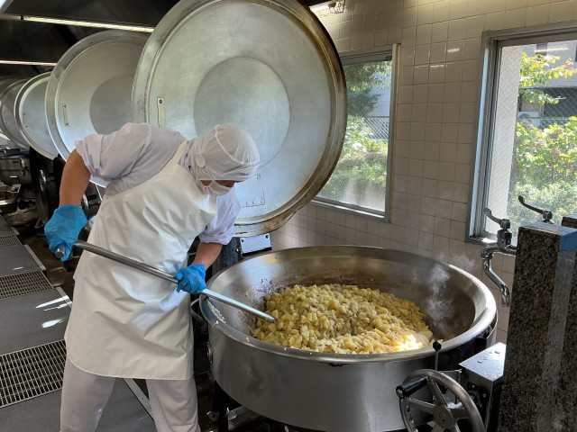 11月は「キタアカリ」という品種のじゃがいもを使用します。黄色味が強く、甘みがあるのが特徴です。この日はジャーマンポテトに使用しました。1人分量がそれなりにありましたが、ベーコンの旨味と合わさり生徒たちはよく食べてくれました。