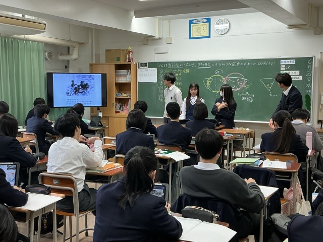 今回の授業は、第二次世界大戦後の冷戦下の世界の動きに注目し、社会的事象を班での調べ学習と話し合いを通して、多面的・多角的に考察することです。
