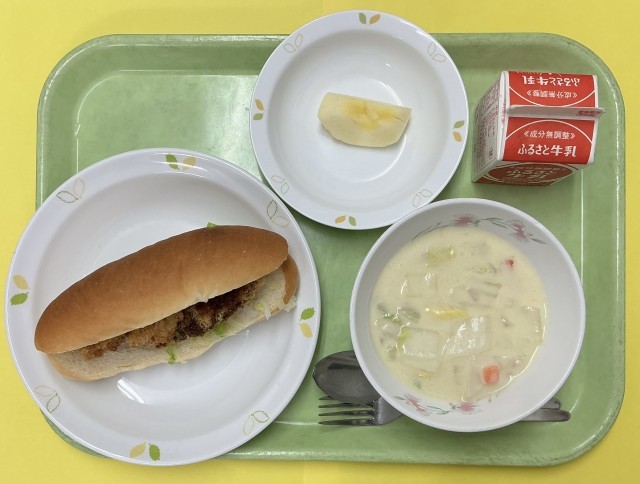 フィッシュサンド、豆乳チャウダー、りんご、牛乳