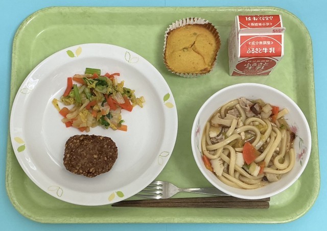 ちゃんこうどん、れんこんと大豆のつくね揚げ、野菜のゆず和え、かぼちゃのケーキ、牛乳