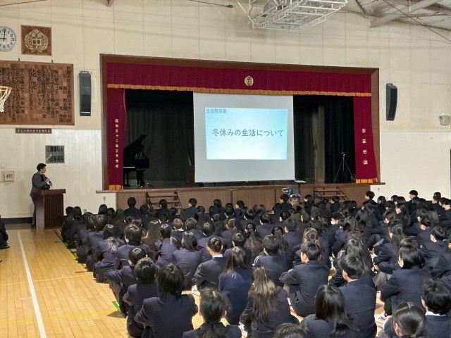 終業式では、代表生徒による2学期の振り返りの発表や、表彰式、先生方による冬休みの過ごし方についてのお話しなどがありました。