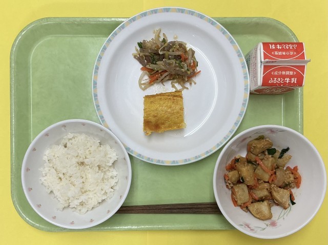 有機米ごはん、千草焼き、こんにゃくサラダ、里芋の肉みそがらめ、牛乳