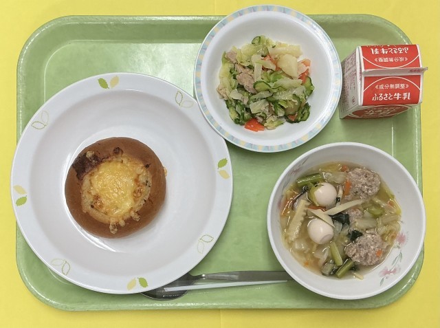 グラタンパン、ツナサラダ、白菜と肉団子のスープ、牛乳