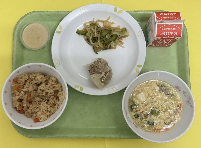 中華おこわ、ジャンボしゅうまい、白菜の中華サラダ、白身魚のウースタン、白ごまプリン、牛乳
