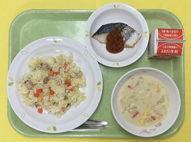 豚肉とコーンのピラフ、魚のバーベキューソース、豆乳チャウダー、牛乳