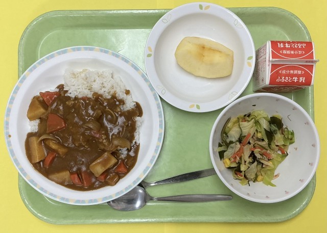 ポークカレーライス、ツナと海藻のサラダ、りんご、牛乳