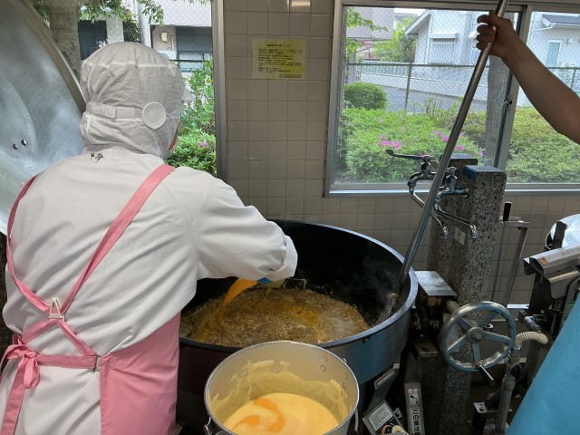 親子丼は、かつお出汁や調味料で具材をよく煮た後に、溶き卵を加えて仕上げました。大量調理では一気に加えると卵の温度が上がりにくいため、少しずつ加えていきます。釜底は焦げ易いので、火加減に注意して時々混ぜながら、仕上げました。