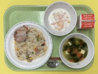 ごはん、鮭の照りごま揚げ、小松菜のごま和え、春野菜のうま煮、牛乳