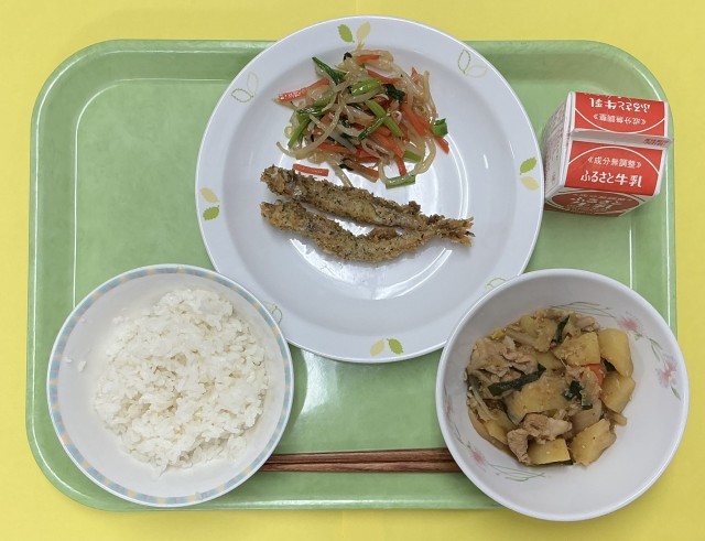 有機米ごはん、ししゃもの青のりフライ、ナムル、韓国風肉じゃが、牛乳