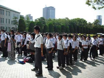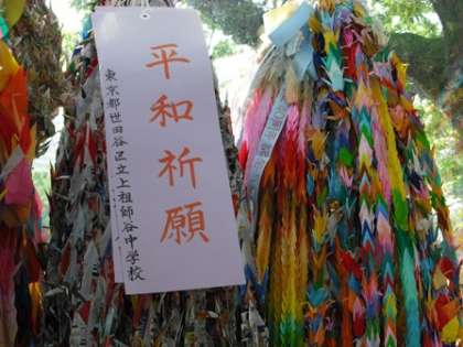 修学旅行2日目は広島へ移動、被爆された方から貴重なお話を伺った後、平和資料館見学を含む平和公園内の班行動を行いました。原爆の子の像の前にある折り鶴を保管できる場所に、学年のみんなが平和への祈りをこめて折った千羽鶴を安置しました。