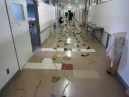 体育祭予行準備中、3年生有志の皆さんが『大縄跳び』用具の調整をしています。工夫をしながら、より速く進むように調整をしていました。当日まであとわずか、がんばってください。