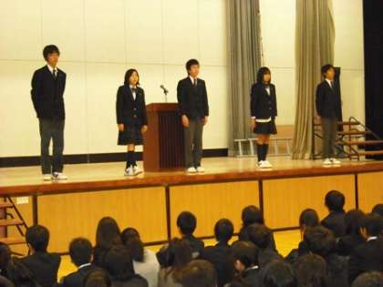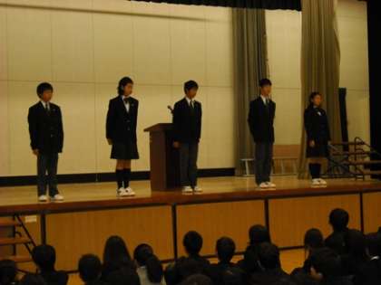 まず、旧生徒会役員から、新生徒会役員への引き継ぎです。生徒会長を1年間務めてきた3年生は、「これからも生徒会役員だけでなく、みんなでこの上祖師谷中学校の生徒会を盛り上げていこう」という力強いあいさつがありました。