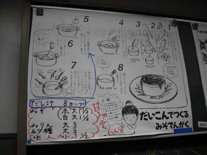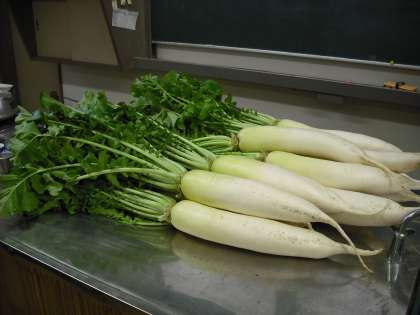 ちょうど環境問題も学習したところでしたので、「なるべく食材のゴミを出さないように、大根を丸々1本使いきろう!」ということを目標に実施しました。地元(本校の保護者)が無農薬で作っている大根をわざわざ運んでくださいました。こんなに葉っぱが見事な大根、なかなかお目にかかれませんね。
