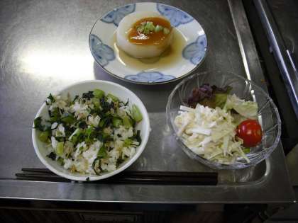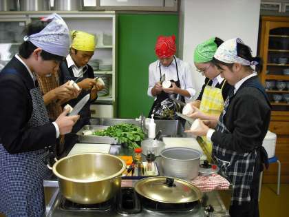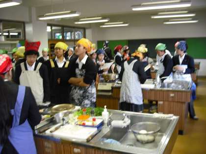 普段見られないような青々とした大根の葉に歓声を上げ、なによりも調理の工夫をすれば、食材は残すことなく食べることができるのだということに気づいた人も多かったようです。身近でできるエコ…。できるところから実践していきたいですね。ちなみに今日の調理実習のメニューは、「大根のみそでんがく」「大根の葉とじゃこの炒め物」「大根サラダ」でした。