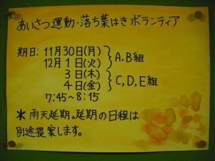 今年は落ち葉はきボランティアと一緒に、あいさつ運動を行います。落ち葉はきボランティアに参加する人、登校してきた人、地域の方々に元気良くあいさつをし、気持ちの良い朝を上中生全員で作ります!