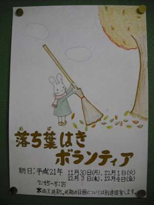 11月30日(月)、12月1日(火)、12月3日(木)、12月4日(金)の7時45分から、落ち葉はきボランティアとあいさつ運動を行います。美術部と生徒会本部の生徒が、ポスターを作成して、校内に掲示してくれました。どのポスターも素晴らしい出来栄えです。