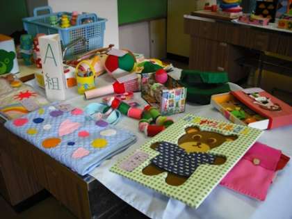 3年生が家庭科の授業中に作った「幼児のおもちゃ」を、2階奥調理室に展示してあります。