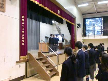 2月 生徒会朝礼 公開日 2015/02/02 更新日 2015/02/02 おしらせ 2月2日(月) 生徒会朝礼がありました。体育委員会等から連絡がありました。生徒会朝礼後は、吹奏楽部・サッカー部の【表彰】を行いました。また、8日(日)【第6回中学生東京駅伝大会】に区代表選手として参加予定の2年女子生徒の紹介も行いました。体調を整えて当日に臨んでもらいたいと思います。 いいね(0)