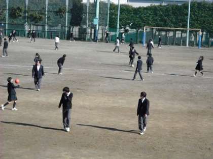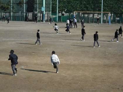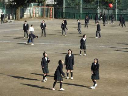 本校では、多くの生徒が、昼休みに校庭に出て元気よく体を動かしています。寒さを吹き飛ばすようにワイシャツ1枚でサッカーボールを追いかける生徒あり、輪になってバレーボールを楽しそうにやっている生徒あり、中庭(ピロティー)では、バスケットボールの試合をやっている生徒あり…。楽しそうに校庭を走り回っている姿は、見ていて元気をもらえます。