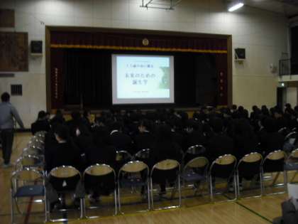体育館にて3年生が「15歳の命に送る〜未来のための誕生学〜」の講演を受けました。父母と教師の会本部主催の次世代育成支援を目的としたライフスキル教育です。3年生の皆さんは、講師の方の情熱あふれる講演に、自己を再認識した時間となりました。