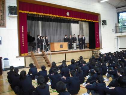 いよいよ27年度が始まります。保護者・地域の皆様、今年度も上祖師谷中学校をどうぞよろしくお願いいたします。朝、クラス発表があり、学年の先生から名表をもらい自分のクラスを確認しました。その後、今年度に着任した先生の「着任式」がありました。