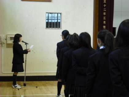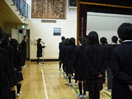 1/18(月)、全校朝礼がありました。校長先生からのお話のあと、今日は生徒会からのお知らせがありました。生徒会では、ボランティア活動の一環として、ペットボトルキャップの回収をするということです。以下は生徒会長からの呼びかけメッセージです。