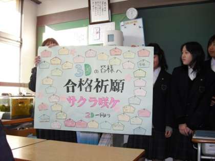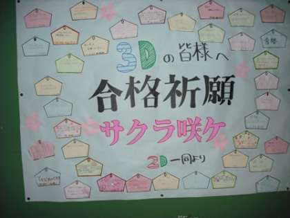 2Dから3Dへのメッセージ受け渡しの様子と、応援メッセージです。2Dは、クラス代表だけでなく、クラス全員で3Dにメッセージを届けに来てくれました。下級生の心温まる応援は、きっと3年生に届いたことでしょう。