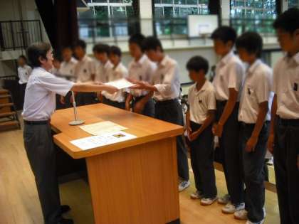 生徒会朝礼・部活動表彰 公開日 2015/07/13 更新日 2015/07/13 おしらせ 7月13日(月) 今日は生徒会朝礼でした。整備委員長から学期末の「美化デー」への活動協力の依頼がありました。その後、表彰を行いました。テニス部団体戦【区3位】、サッカー部【区3位・第2支部大会1位】、野球部【区1位】の表彰です。この3つの部は「都夏季大会進出」となりました。おめでとうございます!!都大会での活躍を期待しています!!! いいね(0)