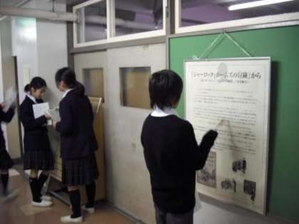 内容は「シャーロック・ホームズの倫敦」となっており、写真パネルが2階の廊下に47枚ほど貼られております。この3月にはシャーロック・ホームズの映画も上映されるということで、昼休みや放課後などを使って見ている生徒も多くいました。展示物にちなんだクイズシートに熱心に取り組んでいる姿がとても印象的でした。