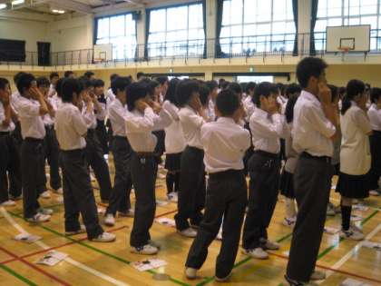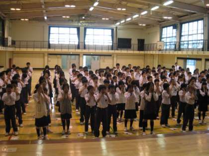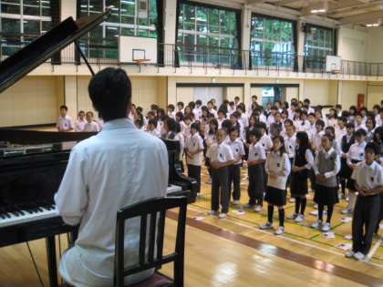 14日月曜日の朝礼の後、1年生は体育館で「校歌練習会」を行いました。