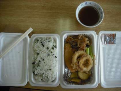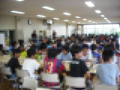 雨のため、朝礼は体育館で行いました。食事は食堂にみんなで集まり、「いただきます」の言葉で始まります。昼食はお弁当形式です。