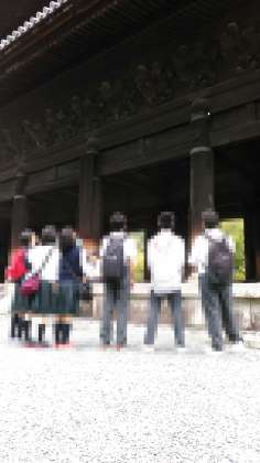新幹線にて京都に着きました。班行動にて京都市内を巡ります。「二条城」または「南禅寺」をチェックポイントに一つ選び、事前に学習した場所を見学します。宿に16時30分到着予定です。有意義な時間を過ごしてほしいものです。※写真は「南禅寺三門」です。