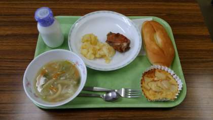 ソフトフランスパン、鶏の香り焼き、スパイシーポテト、マカロニスープ、りんごのヨーグルトケーキ