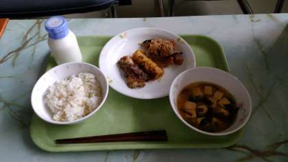 一週間最後の給食です。外は曇り空ですが、おいしい給食に思わず笑顔になりますね。