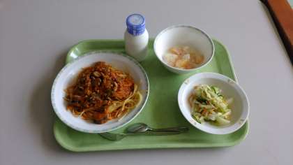 なすとトマトのスパゲティ、フレンチサラダ、フルーツヨーグルト、牛乳