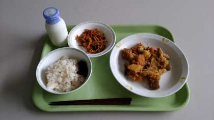 麦ご飯、のりの佃煮、カレー肉じゃが、きんぴらごぼう、牛乳