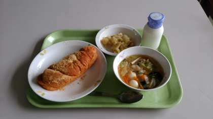 きなこ揚げパン、ミートボールスープ、リヨネーズポテト(フランス料理)、牛乳