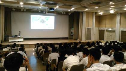 平和公園内で講話を聴いています。語り継がれる歴史から未来を考えています。