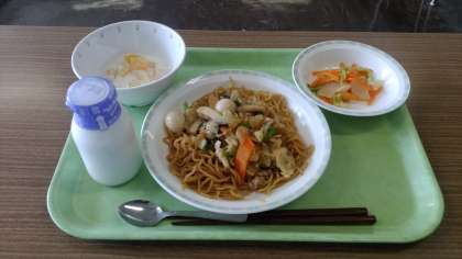 炒めそば五目あんかけ、ラーパーツアイ、フルーツヨーグルト、牛乳