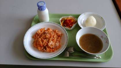 チキンライス、パンプキンチーズオムレツ、オニオンスープ、梨、牛乳