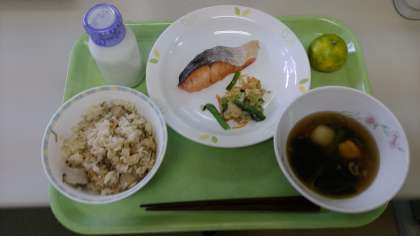 里芋ご飯、さけの塩焼き、ごま和え、二色団子汁、みかん、牛乳
