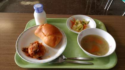 ダイスチーズパン、ハンバーグきのこソース、アップルドレッシングサラダ、コーンスープ、牛乳