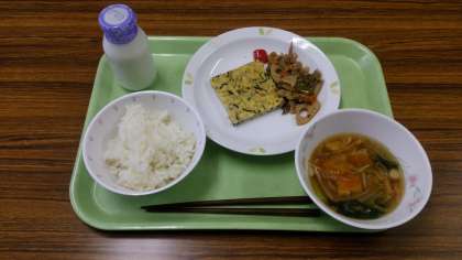 ごはん、ひじき入り卵焼き、彩りきんぴら、のっぺい汁、牛乳