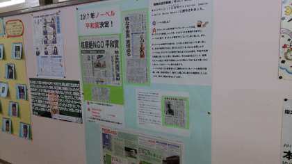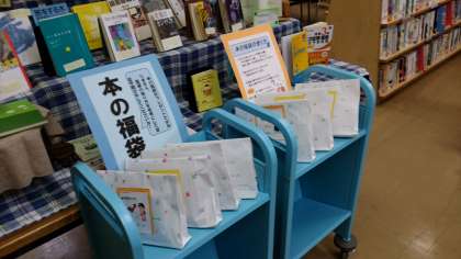 「本の福袋」の企画2日目。入口近くに置いてありますので、立ち寄ってみてください。壁面には新聞記事が掲示されています。活字に親しむ時間を大事にしてください。