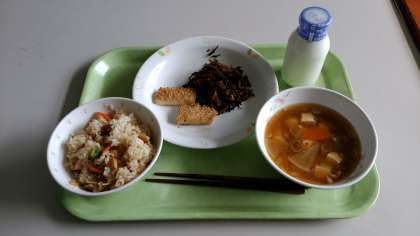 五目ご飯、いかのネギ塩焼き、ごぼうとひじきのきんぴら、具だくさん汁、牛乳