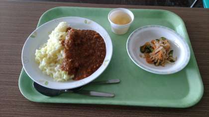 キーマカレー、こんにゃくサラダ、フルーツゼリー
