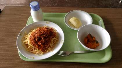 スパゲティミートソース、カボチャサラダ、りんご、牛乳